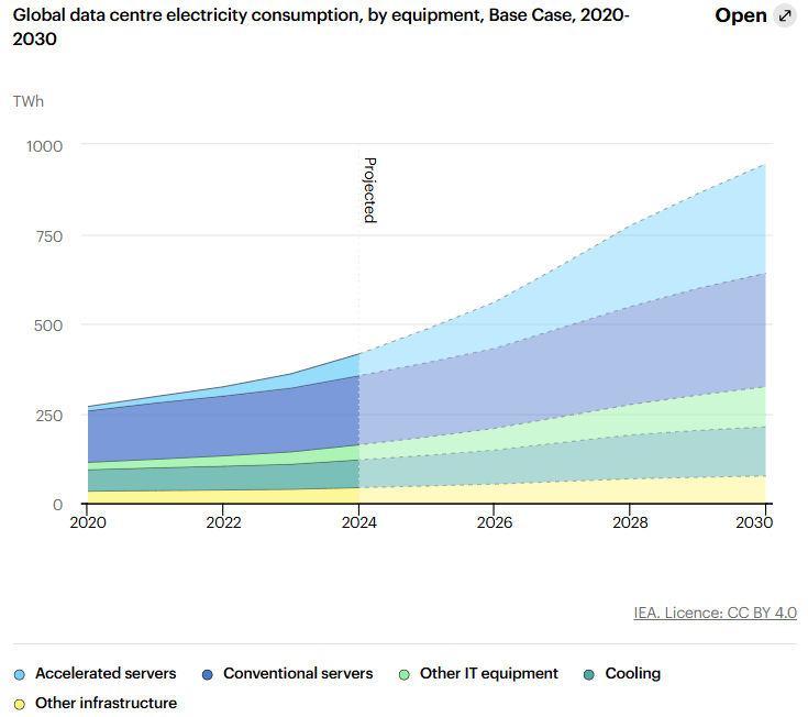 현재 AI 데이터센터의 전력 수요에 비해 글로벌 전력 공급이 턱없이 부족한 상황입니다. 특히 미국 중심으로 이 문제가 두드러지는데, 국제에너지기구(IEA)에 따르면 데이터센터의 전력 소비는 2024년 415 TWh에서 2030년까지 945 TWh로 두 배 이상 증가할 전망이며, 이는 일본 전체 전력 소비량에 해당합니다.