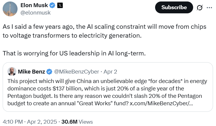 일론 머스크는 AI를 위한 전력 부족에 대한 우려를 지속적으로 주장하고 있습니다.